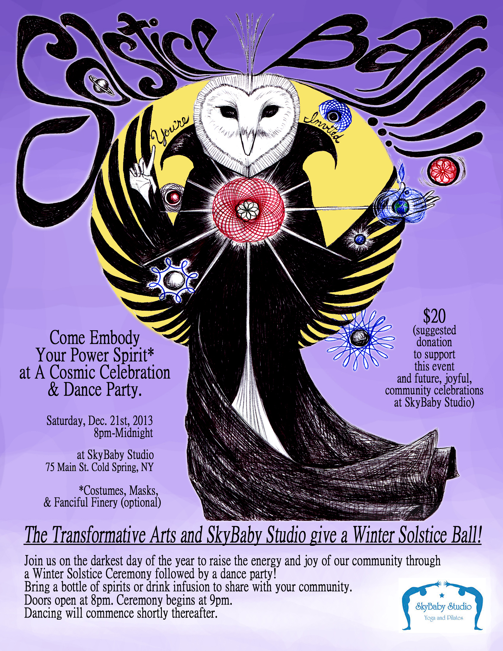 This year, I am working with my town’s center of consciousness, SkyBaby Studio, to offer a Winter Solstice Celebration with ceremonies that incorporate what I have named The Transformative Arts.